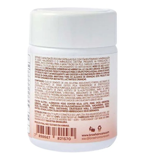 O BRAÉ Defense Suplemento Alimentar é um complexo vitamínico e mineral de alta performance, desenvolvido para nutrir o organismo e fortalecer a saúde dos cabelos, unhas e pele. Sua fórmula avançada atua de dentro para fora, fornecendo nutrientes essenciais que combatem a queda capilar e estimulam o crescimento de fios novos e mais resistentes. Com apenas uma cápsula ao dia, você garante o suporte necessário para manter a vitalidade do bulbo capilar, resultando em um cabelo visivelmente mais denso, brilhante e saudável. É o segredo de luxo para quem busca um tratamento capilar completo e eficaz.