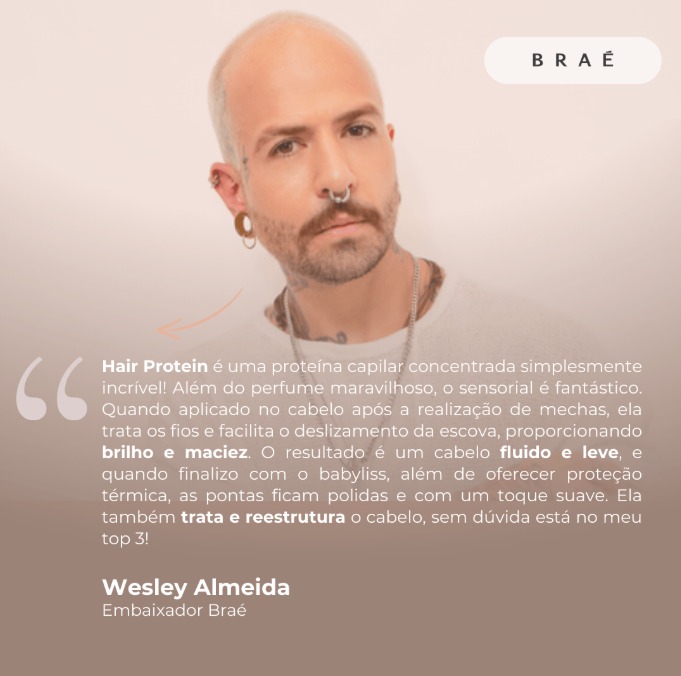A BRAÉ Hair Protein é uma proteína capilar concentrada desenvolvida para repor a massa perdida e fortalecer a estrutura dos fios de forma imediata. Sua fórmula inteligente identifica as áreas fragilizadas da fibra capilar e atua preenchendo as lacunas, devolvendo a resistência e a elasticidade natural do cabelo. Com uma textura leve e de rápida absorção, ela protege contra danos futuros e processos químicos, garantindo cabelos encorpados, saudáveis e com um toque extremamente sedoso. É o cuidado essencial para manter a integridade dos fios no dia a dia.