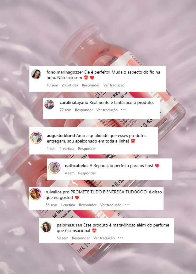 Modo de Uso: Aplicar sobre os cabelos limpos e úmidos, mecha a mecha. Deixar agir por alguns minutos para permitir a penetração dos ativos e enxaguar completamente.